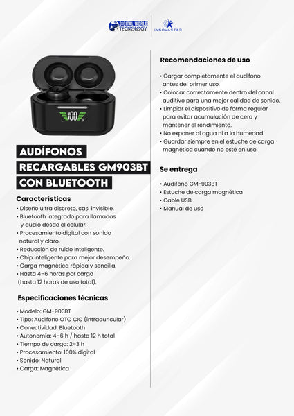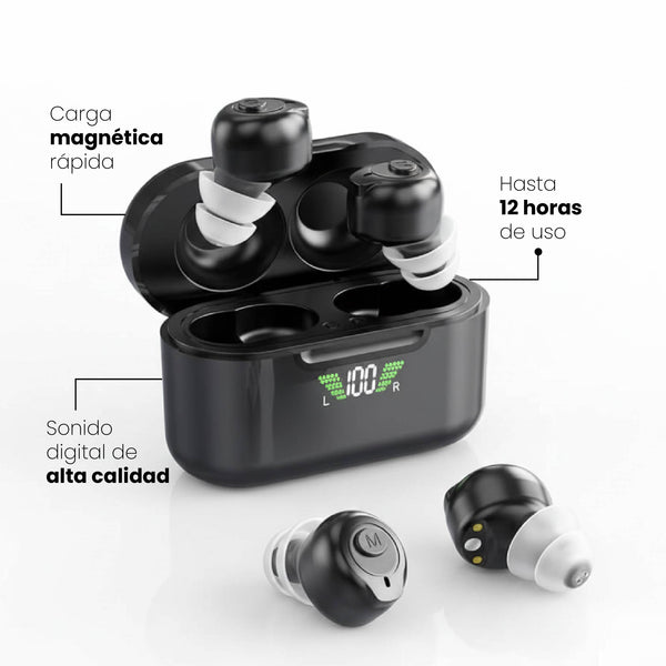 Cuentan con batería recargable de larga duración, estuche con carga magnética y tecnología avanzada de reducción de ruido, lo que permite una escucha más nítida en distintos entornos. Ideales para quienes buscan una solución auditiva práctica, moderna y funcional, con la ventaja adicional de conectarse a dispositivos móviles.