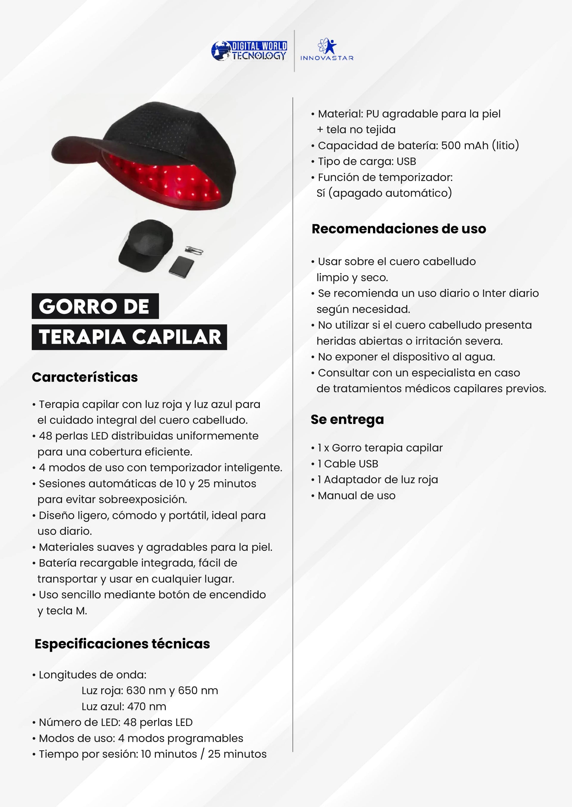 Ideal para personas con caída del cabello, afinamiento capilar o para quienes desean un tratamiento preventivo y complementario desde la comodidad del hogar. Diseño cómodo, práctico y seguro para uso regular.