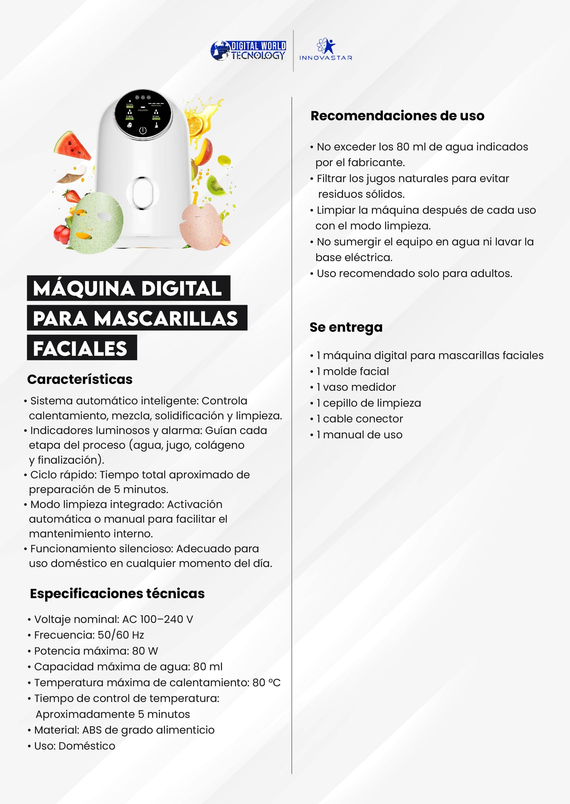 transforma la rutina de cuidado facial al permitir la creación de mascarillas naturales y personalizadas desde casa. Su sistema automático prepara mascarillas en solo 5 minutos, utilizando ingredientes frescos y libres de aditivos, conservantes o sustancias irritantes. Es ideal para el rostro y el contorno de ojos, brindando una experiencia tipo spa de forma práctica y segura.